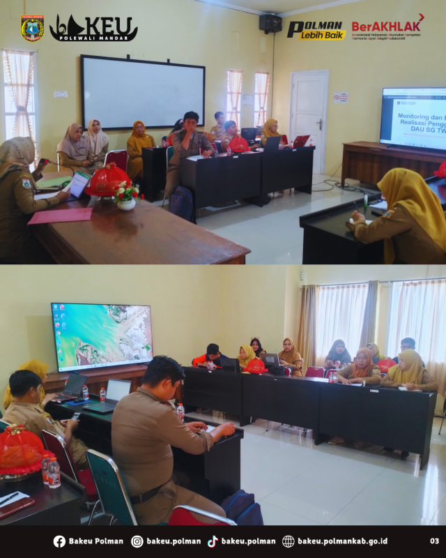 Selasa, 11 November 2025 Monitoring dan Evaluasi Realisasi Penggunaan DAU SG TW III bagi Pemangku DAU SG Bidang Pendidikan dan Kesehatan. Kegiatan diselenggarakan oleh Bidang Verifikasi dan Perbendaharaan Badan Keuangan. Ikuti kami untuk kabar terbaru dan temukan berbagai informasi terkait kami disini: e-mail : badankeu01@gmail.com Facebook : Bakeu Polman Instagram : bakeu.polman Tiktok : bakeu.polman Website : www.bakeu.polmankab.go.id __#VerifikasidanPerbendaharaan#PolmanLebihBaik#BakeuPolman#BadanKeuanganDaerah#PolewaliMandar...